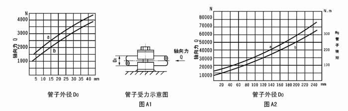 A2 具体内容:图A1 用于“A 系列管夹”;图A2 用于“B 系列Ⅰ型管夹”。a 曲线表示管夹与管子处于“静摩擦状态”时,管子外径尺寸与管夹承受管子轴向力的函数关系。b曲线表示管夹与管子处于“动摩擦状态”时,管子外径尺寸与管夹承受管子轴向力及转矩的函数关系。